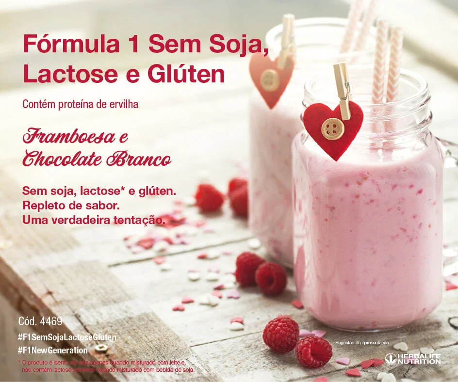 Sabor a Framboesa e chocolate branco feito com proteína de ervilha e não contém soja, lactose e glúten.